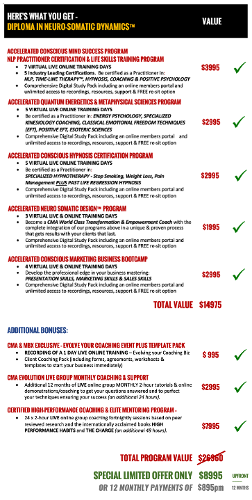The Diploma in Neuro-Somatic Dynamics™ by CMA & The MBX Institute is the most complete, holistic & integrated training in Mindbody Coaching & Transformational Therapy available today. It is the ONLY Practitioner Training available worldwide that includes 12 Certifications and a World Class Marketing Bootcamp to help you get your business started right from the start.